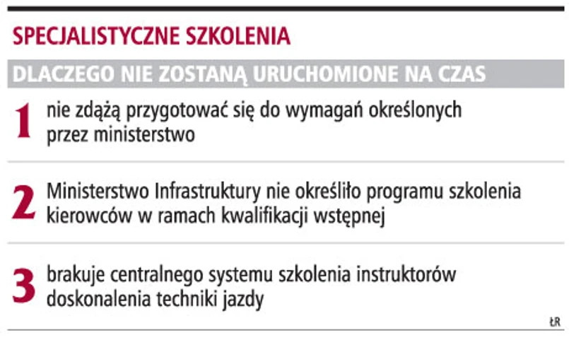Ministerstwo Infrastruktury zbyt późno wydało rozporządzenie o szkoleniach zawodowych kierowców i wymaganiach dla ośrodków doskonalenia techniki jazdy. W konsekwencji, nie ruszą na czas wymagane prawem specjalistyczne szkolenia dla kierowców autobusów. Ośrodki doskonalenia techniki jazdy nie zdążą do 10 września (wchodzą w życie tego dnia przepisy prawa transportowego) spełnić wszystkich ministerialnych wymagań. Dlatego też kierowcy, którzy prawo jazdy kat. D (autobusy) zdobędą po 10 września, nie będą mogli zawodowo przewozić osób.