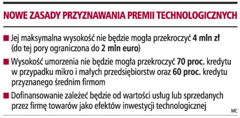 - Ostatni nabór wniosków na starych zasadach odbył się w kwietniu 2008 r. - podkreśla Ewa Balicka-Sawiak, rzecznik prasowy Banku Gospodarstwa Krajowego. 1 stycznia 2009 r. w ramach Programu Operacyjnego Innowacyjna Gospodarka zostanie uruchomiony projekt Kredyt technologiczny o wartości prawie 1,5 mld zł. Środki te będą przeznaczone na premie technologiczne.