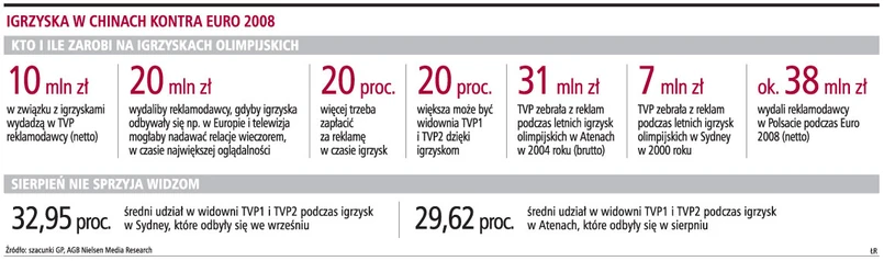 To wszystko z okazji największej i najbardziej prestiżowej imprezy sportowej, jaką są igrzyska olimpijskie, które w sierpniu odbędą się w Chinach. Tym razem jednak wiele globalnych koncernów tak bardzo skoncentrowało się na chińskim rynku, że ich działania ominą Polskę. Zbliżająca się impreza nie zapewni polskim mediom tak dużego zainteresowania reklamodawców, a w efekcie ich pieniędzy, jak podczas zakończonych niedawno mistrzostw Europy w piłce nożnej. Reklamodawcy nie garną się do telewizji m.in. z powodu ogromnych różnic czasowych, uniemożliwiających pokazywanie relacji w najlepszym czasie antenowym. Ile rzeczywiście pieniędzy pojawi się w Polsce w związku z igrzyskami?
