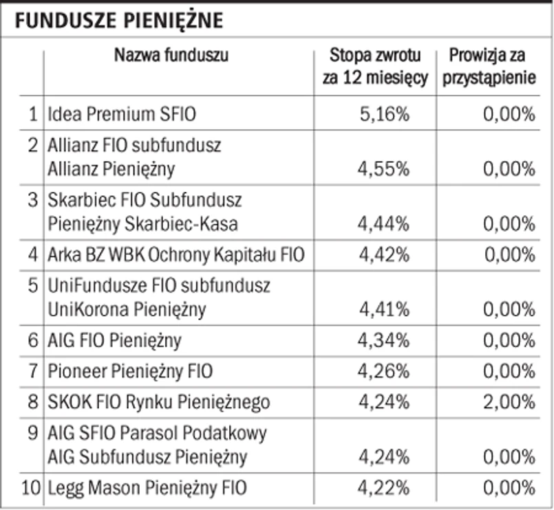 Do naszego zestawienia depozytów bankowych zostały dołączone oferty inwestycyjno-ubezpieczeniowe, przy czym oprocentowanie polis zostało ubruttowione, aby zysk z inwestycji był porównywalny do zysku z lokat. Z zestawienia wyraźnie wynika, że dla osób zdecydowanych na zamrożenie pieniędzy na 12 miesięcy atrakcyjniejsze od depozytów są certyfikaty ubezpieczeniowe. Przegrywają natomiast fundusze rynku pieniężnego, które niedawno stanowiły alternatywę dla ofert bankowych. Trzeba pamiętać, że w przypadku funduszy są to wyniki historyczne za ostatni rok. Za 12 miesięcy mogą wyglądać inaczej, zwłaszcza że część ich portfela stanowią również depozyty bankowe.