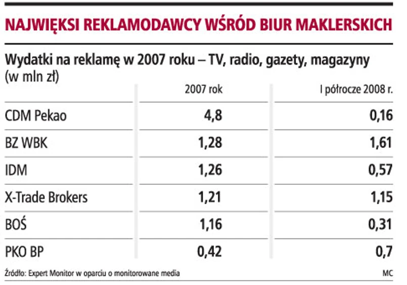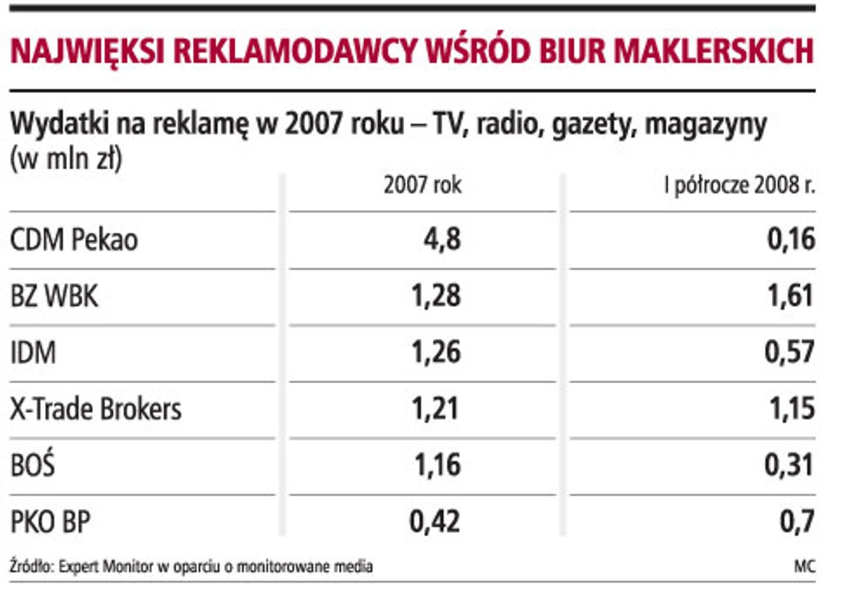 Według danych firmy Expert Monitor łącznie wydatki na reklamy biur maklerskich wzrosły w I półroczu 2008 r. do niemal 9,7 mln zł z 6,9 mln zł w I półroczu 2007 r. Do tej kategorii firma włącza jednak GPW. Wyłączając giełdę, do końca czerwca na reklamę brokerzy wydali 6 mln zł wobec 6,4 mln zł rok wcześniej (szacunki nie obejmują kin i outdooru). W całym 2007 roku sięgnęły 11,7 mln zł.