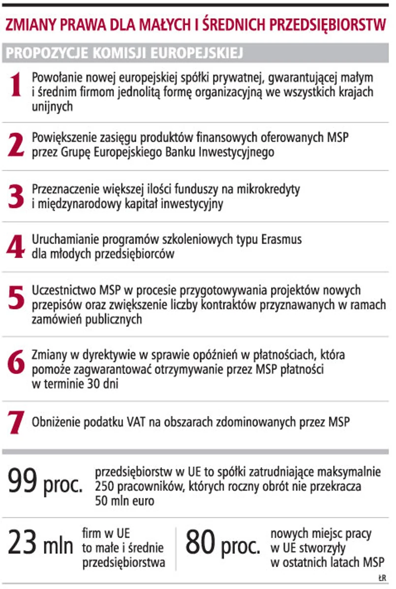Komisja Europejska przygotowała wytyczne, które państwa członkowskie powinny wprowadzić do krajowego ustawodawstwa, by ułatwić funkcjonowanie małych i średnich firm. Przyjęty przez nią Small Business Act for Europe zawiera 10 zasad, których stosowanie uprości prowadzenie działalności gospodarczej przez małe i średnie firmy (MSP) oraz wzmocni ich pozycję na rynku wewnętrznym.