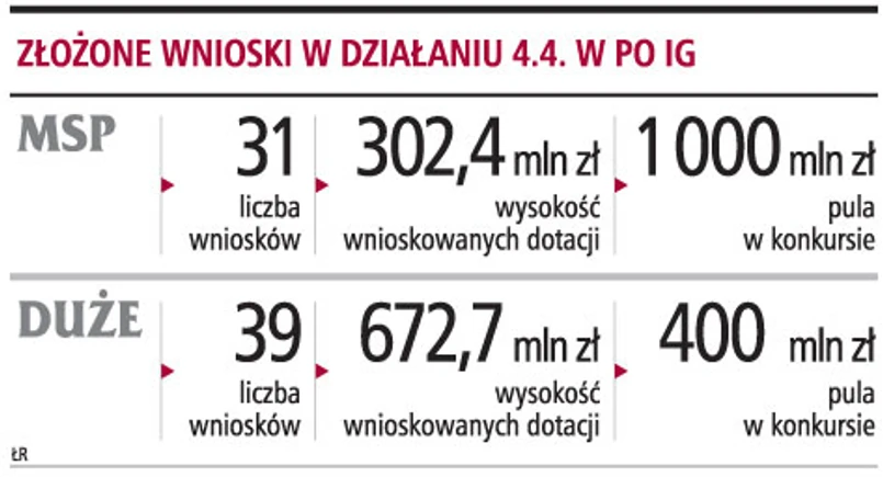 Ta ostatnia liczba najbardziej martwi. Konkurs w Działaniu 4.4. w programie Innowacyjna Gospodarka tak został skonstruowany, że 70 proc. środków (1 mld zł) ma trafić do małych i średnich firm. Tymczasem takie firmy złożyły do tej pory wnioski na 300 mln zł.