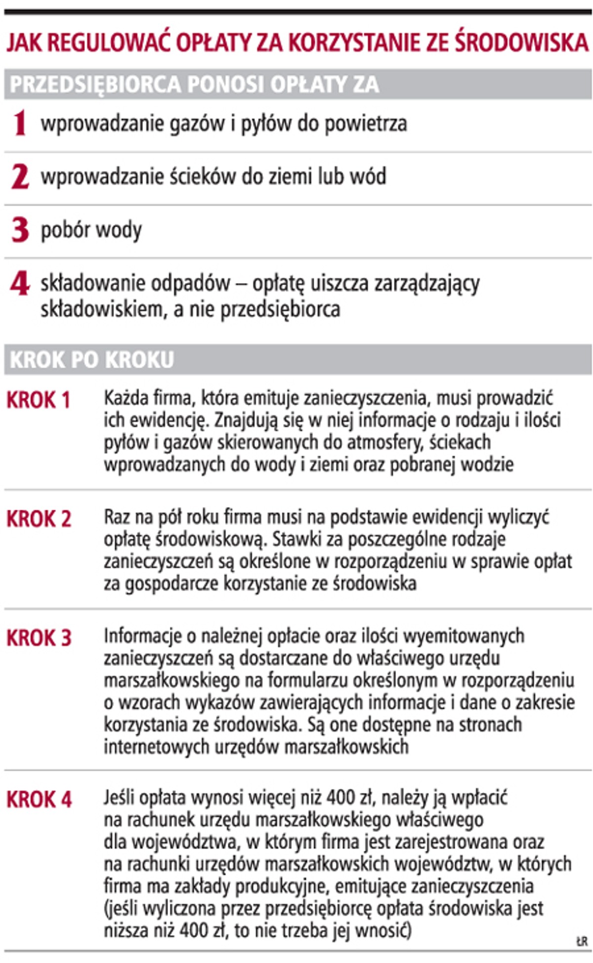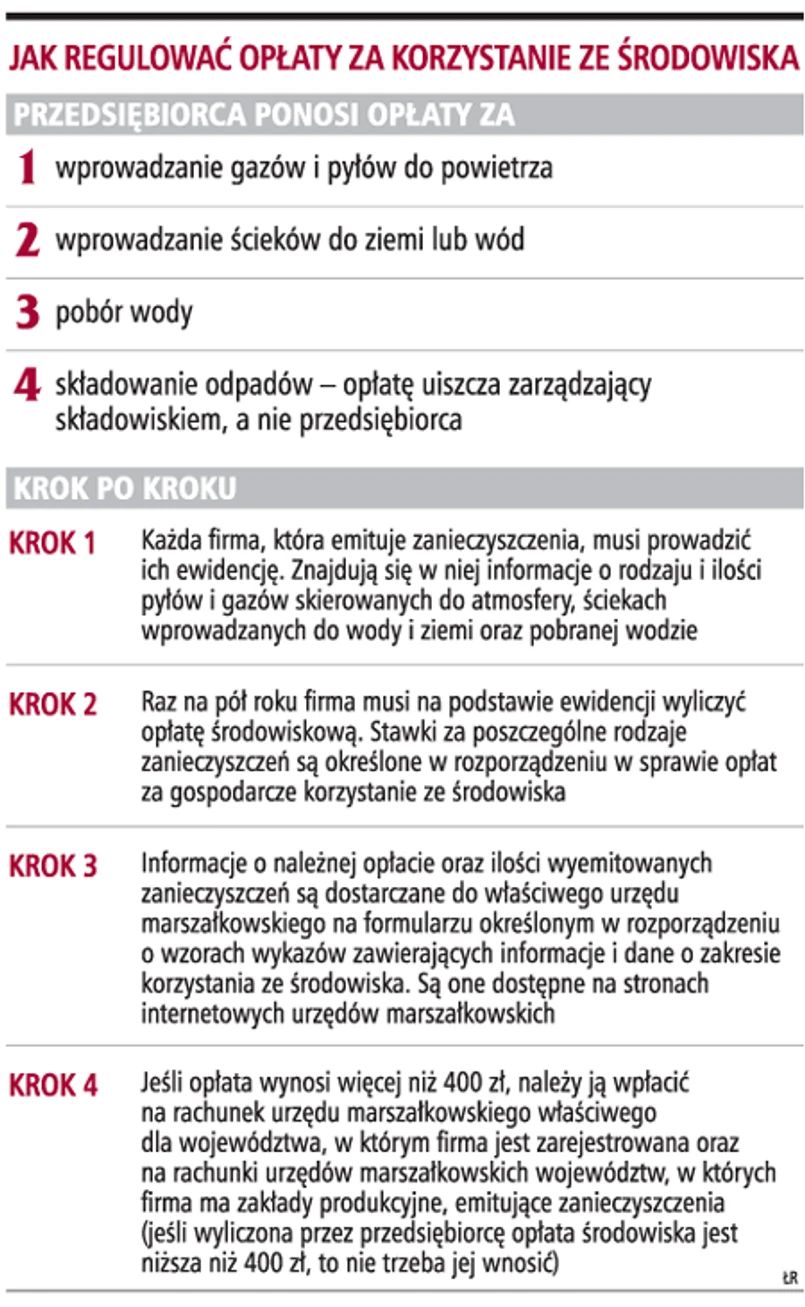 Obowiązek ponoszenia opłat za korzystanie ze środowiska nakłada na firmy i inne podmioty ustawa Prawo ochrony środowiska. Według niej opłata jest odprowadzana do urzędów marszałkowskich w cyklu półrocznym. Firmy, które jej nie zapłaciły za I półrocze 2008 r., mają czas tylko do końca lipca. W przypadku II półrocza terminem jej wniesienia będzie koniec stycznia 2009 r. Od tej zasady są jednak wyjątki.