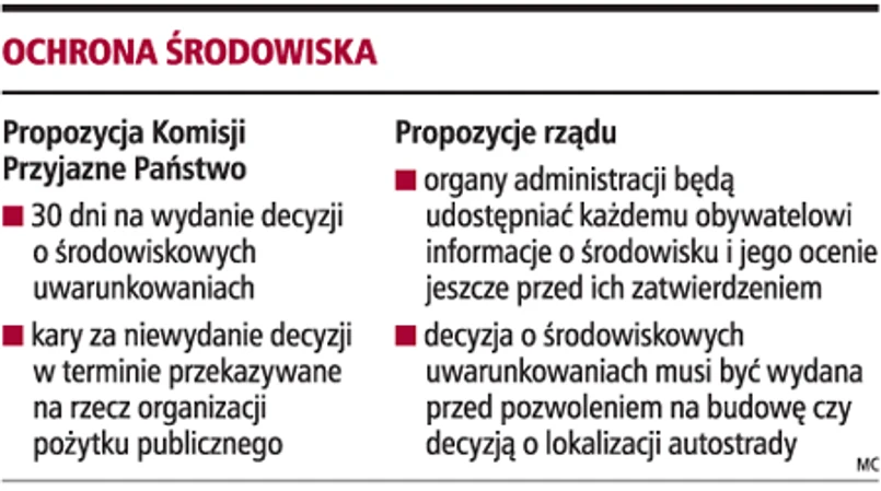 Dodatkowo gdy właściwy organ nie wyda decyzji o środowiskowych uwarunkowaniach w terminie 30 dni od złożenia wniosku, wnioskodawca może żądać od samorządu lub Skarbu Państwa kary za każdy dzień zwłoki w wysokości 20 proc. przeciętnego miesięcznego wynagrodzenia. Ma być ona uiszczana na rzecz wskazanej organizacji pożytku publicznego. Spory związane z decyzją o karze rozstrzygać będą sądy powszechne.