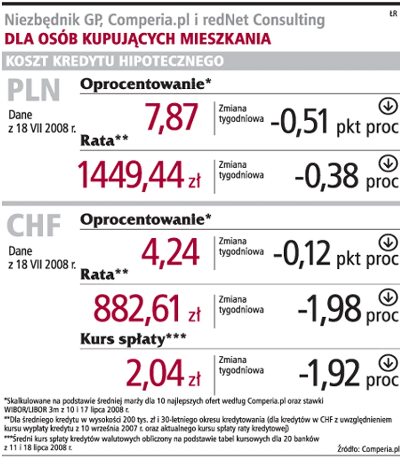 Rata przykładowego kredytu hipotecznego w złotych wyliczanego przez Comperię wyniosła na koniec ubiegłego tygodnia 1449 zł, czyli była po raz pierwszy od kilku zestawień niższa w stosunku do poprzedniego tygodnia. Spadło oprocentowanie o 0,04 proc. do 7,97 proc. W przypadku franka rata przykładowego kredytu obniżyła się o ponad 17 zł i spadła do 883 zł. Stało się tak dzięki bardzo mocnemu złotemu.