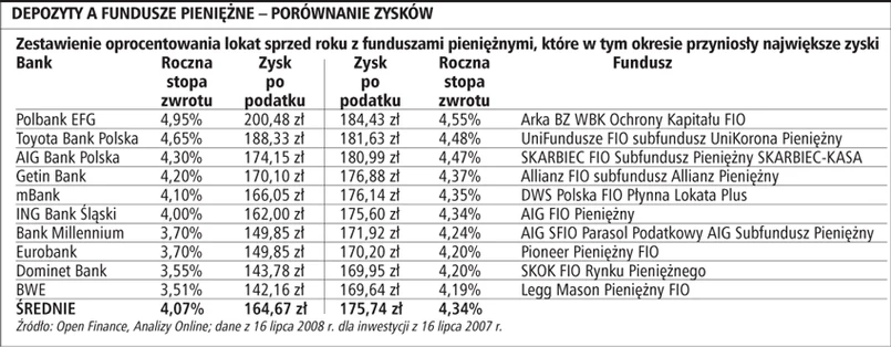 Atutem lokaty jest to, że już w chwili jej zakładania wiemy, jakie otrzymamy odsetki. W przypadku funduszu nigdy do końca tego nie wiadomo. Jedynym sposobem, aby porównać wyniki tych dwóch produktów, jest zestawienie ich wyników historycznych. W tabeli zamieściliśmy więc dziesięć banków, które przed rokiem przyjęłyby od nas depozyt w wysokości 5 tys. zł, oferując najlepsze oprocentowanie. Zestawiliśmy je z dziesięcioma funduszami pieniężnymi, które w tym samym czasie przyniosły największe zyski (wybraliśmy takie, w których minimalna wpłata nie przekraczała 5 tys. zł).