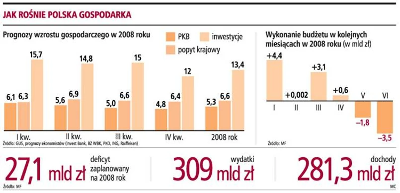 Mimo spowolnienia gospodarczego w II półroczu budżet państwa nie powinien z tego powodu ucierpieć. Z prognoz GP wynika, że wzrost gospodarczy w 2008 roku będzie minimalnie niższy niż założony w ustawie budżetowej (5,3 proc. wobec 5,5 proc.), ale dotychczasowe wykonanie budżetu jest bardzo dobre. Po czerwcu deficyt wyniósł 3,5 mld zł, podczas gdy na cały rok planowane jest 27,1 mld zł.
