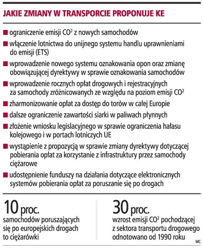 - Pakiet ten dotyczy walki z zanieczyszczeniem i zmianami klimatu. Dzięki niemu to zanieczyszczający, a nie podatnik, będzie ponosić koszty szkód w środowisku naturalnym. Transport stanie się przez to bardziej ekologiczny, zmniejszą się emisje, zużycie paliwa przez ciężarówki spadnie o 8 proc., a na drogach będzie mniejszy tłok - podkreślił Antonio Tajani, wiceprzewodniczący Komisji Europejskiej odpowiedzialny za transport.