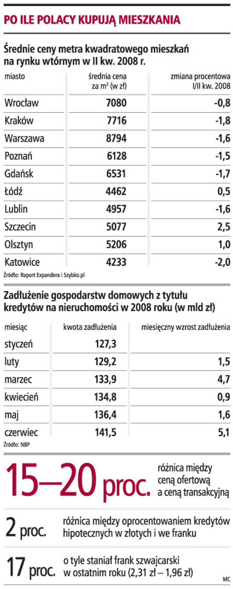 Tylko połowa nowych mieszkań znalazła nabywców. Trudno też sprzedać tysiące mieszkań z rynku wtórnego. Praktycznie nie ma więc możliwości podnoszenia cen. Tylko w Warszawie na nabywców czeka ok. 15 tys. nowych mieszkań. Zdaniem wielu specjalistów polski rynek jest w stanie równowagi i ceny w najbliższych miesiącach się nie zmienią. Większe przeceny mogą dotyczyć jedynie starszych lokali z wielkiej płyty, położonych w mało atrakcyjnych dzielnicach, które są słabo skomunikowane z centrum. Lokale nowsze, dobrze położone, tańsze już nie będą.