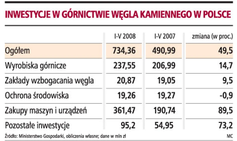 W górnictwie zaczęły wzrastać inwestycje. Od stycznia do maja 2008 r. spółki górnicze wydały ponad 734 mln zł i było to prawie 50 proc. więcej niż w analogicznym okresie 2007 roku. Główna pozycja wydatków to zakup maszyn i urządzeń, na co kopalnie wydały już prawie 400 mln zł. Dostawcy kopalni zauważają poprawę koniunktury.
