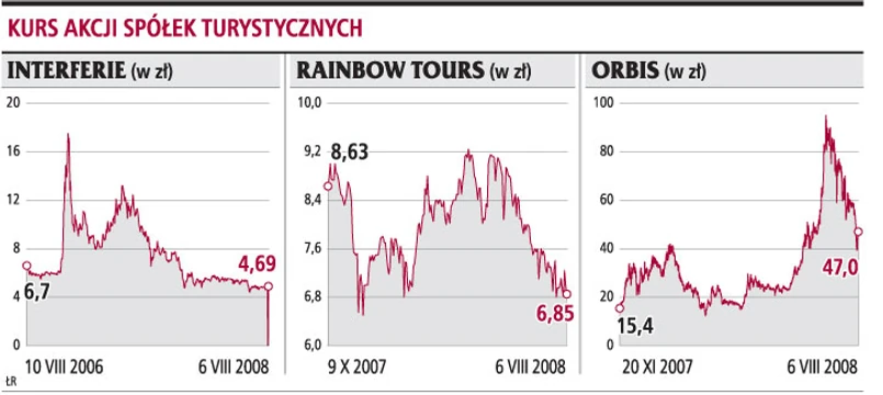 W turystyce krajowej specjalizuje się Interferie, właściciel kilkunastu obiektów w Polsce, od hoteli do ośrodków kolonijnych. Akcje spółki, które dwa lata temu na debiucie w pierwszym dniu notowań kosztowały 6,5 zł, teraz wyceniane są poniżej 5 zł. Na jej kurs, poza zniżkami na GPW, negatywnie wpływały kilkakrotnie obniżki prognoz i słabe wyniki. Rynek z rozczarowaniem przyjął m.in. straty w II kwartale 2008 r., po których analitycy BM BPH oczekiwali, zauważalnie słabszego zachowania kursu akcji spółki w porównaniu do indeksu WIG. Sama spółka tłumaczy słabe wyniki kosztami inwestycji, których efekt ma być widoczny w przyszłości.