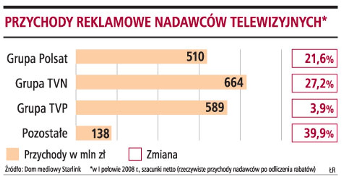 W wygraniu walki o pierwsze miejsce pod względem przychodów nie pomogło Polsatowi Euro 2008, podczas którego zainteresowanie reklamodawców jest większe. Według danych brutto Nielsen Media Research AGB, reklamodawcy wydali na promocję podczas mistrzostw 85 mln zł brutto (według cenników), co po odliczeniu rabatów daje około 40-45 mln zł. Pozwoliło to zwiększyć Polsatowi w II kwartale przychody o 16,1 proc. do 282 mln zł netto, według Starlinka. Mimo to nadawca jest zadowolony z I półrocza.