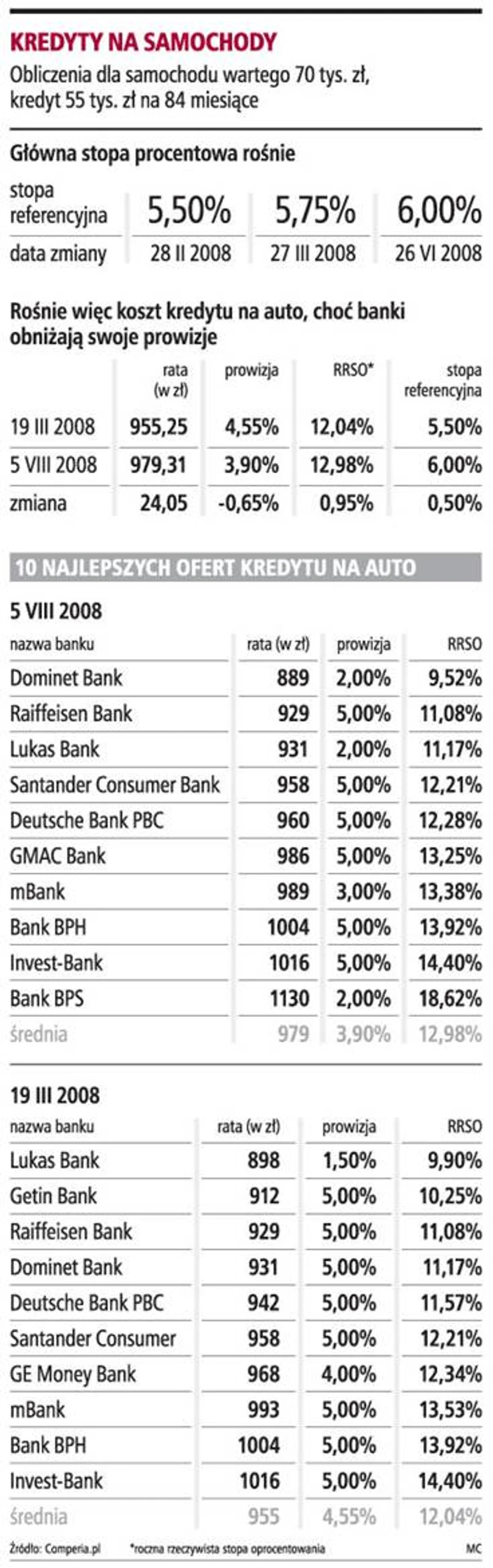 Niestety rosnące stopy procentowe powodują, że generalnie kredyt na auto stał się minimalnie droższy - wynika z porównania przygotowanego dla GP przez Comperia.pl dla 10 banków z najlepszymi ofertami na zakup nowego auta. Zaciągając obecnie kredyt na 55 tys. zł na 84 miesiące, trzeba płacić ratę o 24 zł większą niż w marcu tego roku. Banki starają się walczyć o klienta, dlatego o 0,65 proc. spadła średnia prowizja. To głównie efekt decyzji Dominet Banku, który zmniejszył swoją prowizję z 5 proc. do 2 proc. czy mBanku, w którym spadek wyniósł z 5 proc. do 3 proc. W większości banków te wartości nie zmieniły się, a w Lukas Banku mamy nawet wzrost z 1,5 do 2 proc. Okazuje się jednak, że taka podwyżka podstawowej prowizji to dla banku sposób na stworzenie mechanizmu zachęcającego klientów do skorzystania z innych usług.