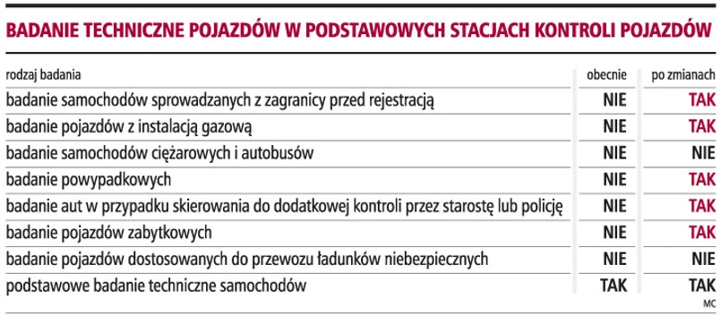 Ministerstwo Infrastruktury przygotowało projekt nowelizacji ustawy z 20 czerwca 1997 roku - Prawo o ruchu drogowym (Dz.U. z 2005 r. nr 108, poz. 908 z późn. zm.), który obligatoryjnie rozszerzy zakres działalności podstawowych stacji kontroli pojazdów. Będą one mogły wykonywać badania techniczne wszystkich pojazdów o masie do 3,5 tony. Badania obejmą m.in. sprawdzanie aut powypadkowych, zasilanych gazem czy sprowadzonych z zagranicy lub skierowanych przez starostę na dodatkową kontrolę.