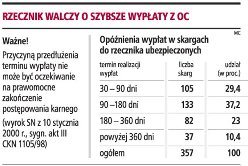Dlatego rzecznik postuluje, żeby w ramach trwających obecnie w Ministerstwie Finansów prac nad zmianą ustawy o ubezpieczeniach obowiązkowych wprowadzić zasadę, że towarzystwa będą musiały wypłacić odszkodowanie nie później niż w ciągu 30 dni. Obecnie w ubezpieczeniach dobrowolnych (w art. 817 k.c.) mamy zasadę, że towarzystwo musi wypłacić pieniądze w ciągu 30 dni. Dłużej może likwidować szkody w bardziej skomplikowanych przypadkach, ale wypłaty trzeba realizować w ciągu 14 dni od ich wyjaśnienia przy zachowaniu należytej staranności. W ubezpieczeniach obowiązkowych mamy 30 dni na wypłatę tzw. kwoty bezspornej, ale w uzasadnionych okolicznościach na wypłatę trzeba czekać nie dłużej niż 90 dni. Najczęściej pretekstem jest oczekiwanie na prawomocne zakończenie postępowania karnego, choć Sąd Najwyższy już dawno orzekł (wyrok SN z 10 stycznia 2000 r., sygn. akt III CKN 1105/98), że towarzystwo ma samo ustalać zakres swojej odpowiedzialności, nie czekając na sąd.