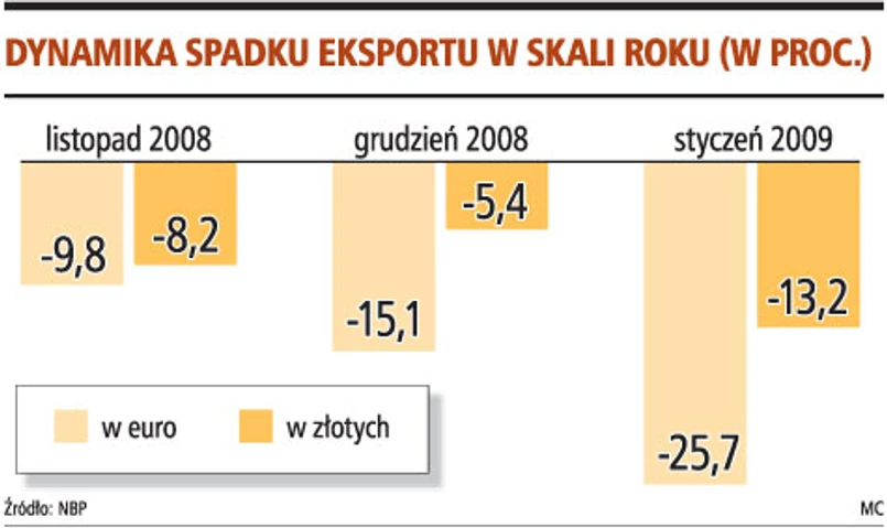 NBP we wtorek po świętach poda dane o obrotach handlu zagranicznego. Ekonomiści, z którymi rozmawialiśmy, oczekują co najmniej utrzymania dynamiki spadku eksportu ze stycznia, czyli 25-proc. Niektórzy spodziewają się zwiększenia spadku w lutym.