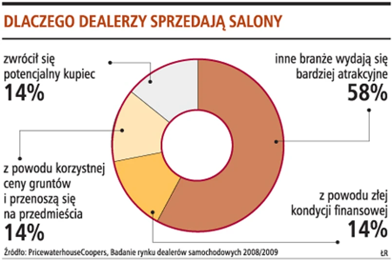 Z badania PricewaterhouseCoopers wynika, że około 7 proc. dealerów myśli o wyjściu z branży, a 80 proc. w ogóle nie rozważa takiej opcji. Analitycy PWC wskazują, że wśród ankietowanych, którzy myślą o pozbyciu się salonu, większość to dealerzy, którzy prowadzą działalność od ponad dziewięciu lat, w formie biznesu rodzinnego. Jako przyczyny rezygnacji podają złą sytuację finansową i złą współpracę z dystrybutorem krajowym.