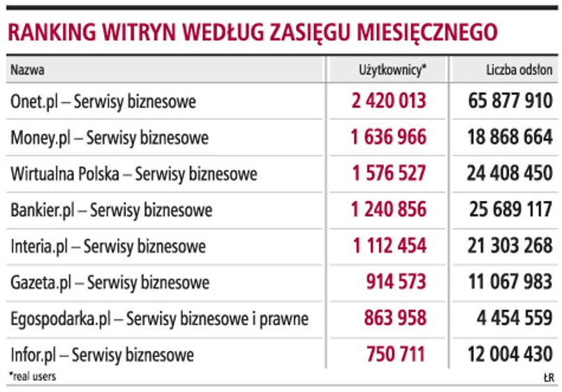 W maju z 20 największych serwisów zaliczanych przez firmę badawczą Gemius do kategorii biznes, finanse, prawo korzystało blisko 15 mln użytkowników - wynika z badań Megapanel Gemius/PBI. Ale liczba ta jest jeszcze większa, bo portale i serwisy nie ograniczają się tylko do informacji biznesowych, ale coraz częściej wchodzą w kolejne nisze, tworząc własne serwisy poświęcone motoryzacji, podatkom, prawu, rynkowi pracy czy nieruchomościom. I sprzedają w nich powierzchnię reklamową.