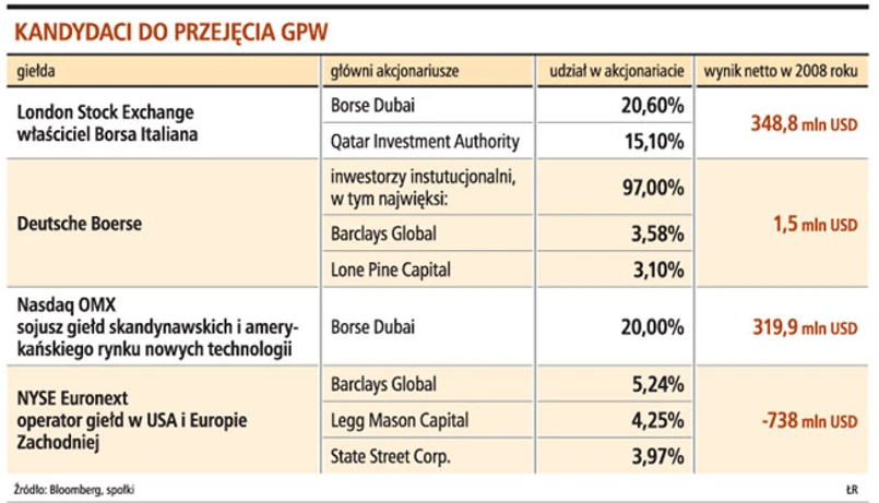 Przyznaje, że poza czterema giełdami, z którymi chce negocjować resort, nie ma kandydatów, którzy dysponują doświadczeniem i możliwościami, które zapewniłyby GPW przewagę w konkurencji z Wiedniem. Z tą giełdą przegraliśmy walkę o parkiety w Pradze, Budapeszcie i Lublanie. Jedną z przyczyn był większościowy udział państwa w akcjonariacie GPW.