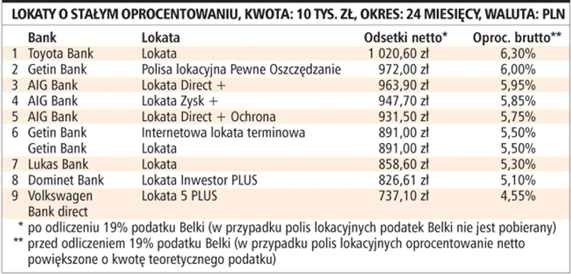 W kategorii długoterminowych lokat dwuletnich najwyższe stałe oprocentowanie w wysokości 6,3 proc. oferuje Toyota Bank. Niewiele mniej otrzymamy w Getin Banku i na jednej z lokat AIG Banku.