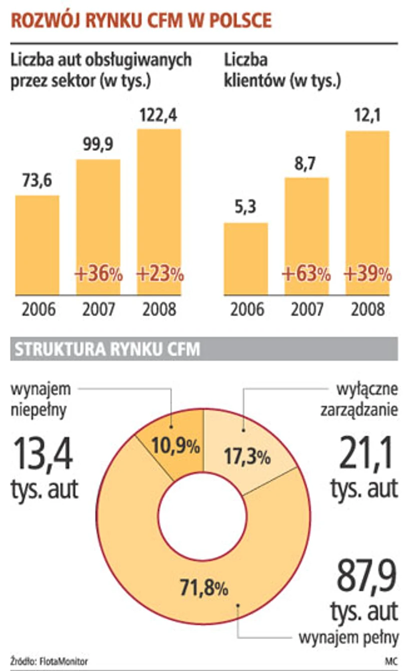 Choć na razie firmy zarządzające flotami (tzw. CFM, z ang. Car Fleet Management) widzą mniejszy popyt na swoje usługi ze strony przedsiębiorców, to na koniec roku zgodnie spodziewają się 8-10-proc. wzrostu liczby aut. Będzie to oznaczało, że na koniec 2009 roku liczba aut obsługiwanych przez branżę CFM, wyniesie 132-135 tys.