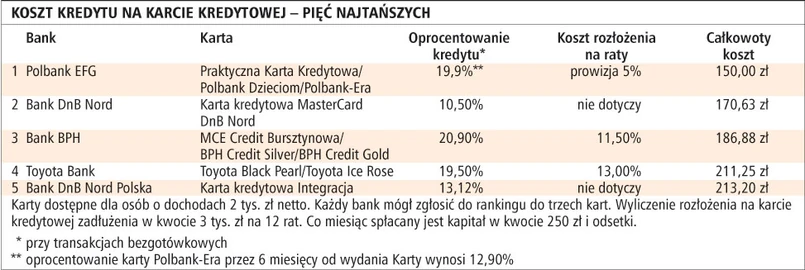 W dłuższym okresie karta kredytowa także może być źródłem taniego kredytu. W przypadku rozłożenia kwoty 3 tys. zł na 12 rat najniższy koszt kredytu zapłaci posiadacz karty kredytowej Polbanku. Choć oprocentowanie karty wynosi aż 19,9 proc., to klient może skorzystać z rozłożenia operacji na raty, płacąc jedynie 5 proc. prowizji. Natomiast najniższe oprocentowanie operacji bezgotówkowych wśród badanych kart ma MasterCard DnB Nord - jedynie 10,5 proc. Trzecie miejsce pod względem kosztów zajęły karty Banku BPH. W tym banku za rozłożenie operacji na raty klient nie musi płacić prowizji, a oprocentowanie rat wynosi 11,5 proc. w skali roku. Ponieważ posiadacze tych kart nie muszą płacić ani za wydanie i korzystanie z nich w pierwszym roku, ani za obowiązkowe ubezpieczenia, to kosztem kredytu są jedynie odsetki.