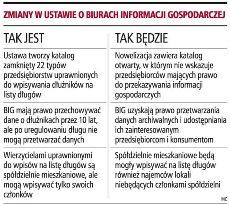 Ten fakt dostrzegł również rząd, który chce znowelizować ustawę o udostępnianiu informacji gospodarczych z 2003 roku i rozszerzyć katalog dłużników, oraz listę tytułów prawnych upoważniających do przekazywania informacji gospodarczej. Lista ta obejmie umowy o przewóz osób i bagażu, o dostarczanie energii, wody, wywóz nieczystości. Nowe przepisy ułatwia też przekazywanie informacji pozytywnych o wywiązywaniu się dłużników z ich zobowiązań.