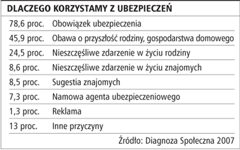 Z kolejnych etapów badania Diagnoza Społeczna wynika, że dla około 80 proc. Polaków podstawowym motywem do zawarcia umowy jest obowiązek ubezpieczenia. Ale już dalsze wyniki tych badań mogą nastrajać sprzedawców polis bardziej optymistycznie, bo okazuje się, że dla prawie 46 proc. badanych istotna jest obawa o przyszłość rodziny. Nadal w praktyce okazuje się, że od obawy do ubezpieczenia droga daleka.