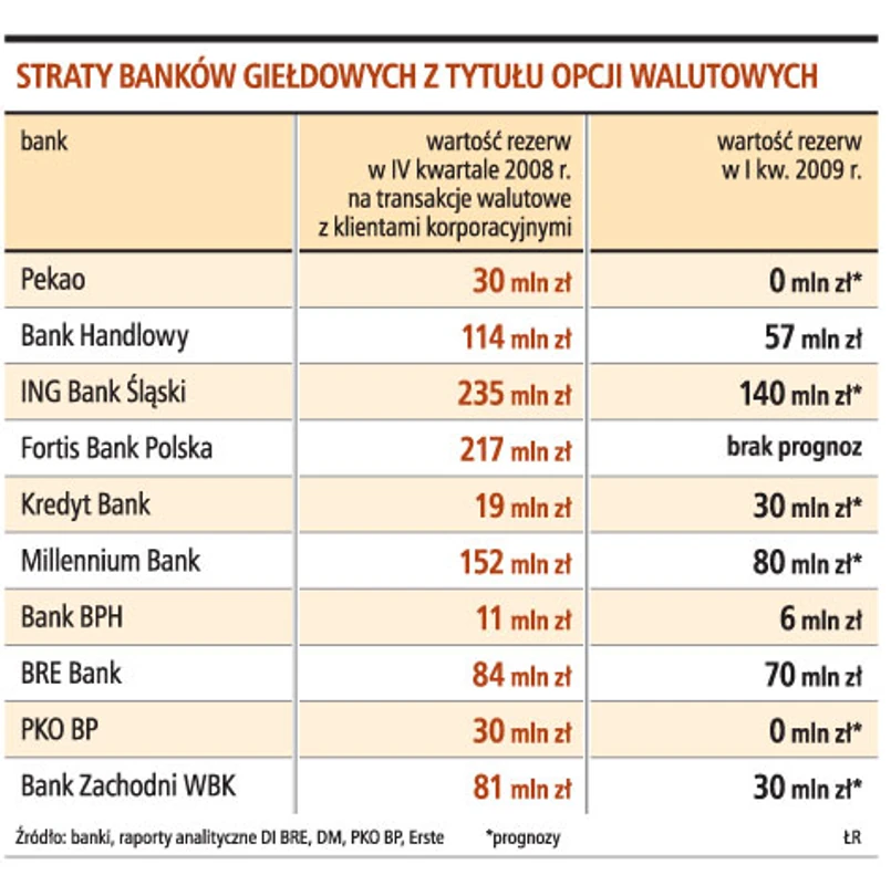 Z wyliczeń GP wynika, że w ostatnim kwartale 2008 r. giełdowe banki utworzyły na transakcje walutowe z klientami korporacyjnymi (tzw. opcje) 970 mln zł rezerw. Po pierwszych trzech miesiącach 2009 r. odpisy z tego tytułu powinny być o połowę mniejsze i zamkną się w kwocie 400–460 mln zł. Te symulacje potwierdzają zresztą wyniki banków, które opublikowały już raporty finansowe za pierwszy kwartał tego roku. W dwóch bankach (BRE i Handlowym), które były w 2008 roku szczególnie aktywne w dystrybucji opcji walutowych, rezerwy, jakie musiały utworzyć na zobowiązania firm z tytułu transakcji opcyjnych, okazały się niższe niż w ostatnim kwartale 2008 r. W przypadku BRE wyniosły one 70,2 mln zł wobec 84 mln zł kwartał wcześniej, a w Handlowym było to analogicznie 57 mln zł i 114 mln zł.