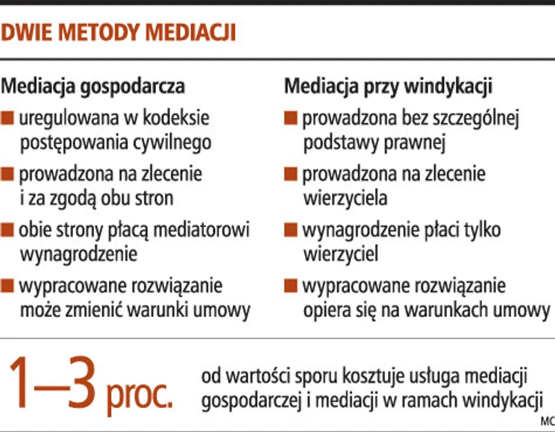 Wierzyciel może zrezygnować z odsetek od długu lub zadowalić się uzyskaniem 70–80 proc. wierzytelności. W obu wypadkach wynagrodzenie za taką usługę to 1–3 proc. wartości sporu przy sprawach od 100 tys. zł. W pierwszym wypadku płaci się je za mediacje gospodarcze, a w drugim za uzyskanie w procesie windykacji kwoty.