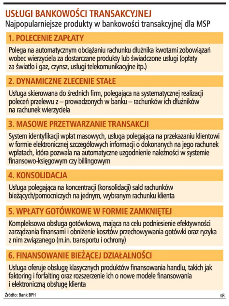 Oprócz Banku BPH usługi bankowości transakcyjnej dla MSP mają m.in. Fortis Bank Polska, BGŻ czy działający od niedawna Alior Bank.