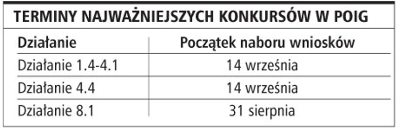 Dwa tygodnie później ruszy największa w tym roku fala unijnych konkursów. Oprócz wcześniej wymienionych już działań 14 września wystartują także nabory w działaniach 4.4 oraz 1.4-4.1 (dotacje na prowadzenie prac badawczo-naukowych).