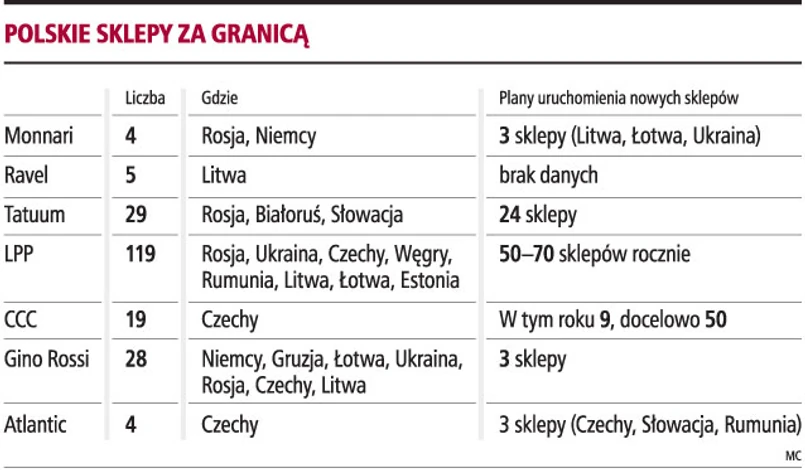 CCC, polski sprzedawca obuwia, koncentruje się tylko na rynku czeskim, na którym pierwsze kroki za granicą stawia co czwarta polska firma handlowa. W tym roku CCC chce otworzyć w Czechach dziewięć nowych salonów, a docelowo ma być ich aż 50. W wypadku firmy Kan i jej sklepów Tatuum już prawie połowa sprzedaży odbywa się poza granicami Polski. Firma chce w październiku otworzyć nowy sklep w Dubaju w powstającym tam największym centrum handlowym na świecie. Plany rozwoju własnych sklepów za granicą ma też Monnari - w tej chwili firma ma tylko cztery sklepy poza Polską - w Niemczech i Rosji, ale niebawem pojawią się też nowe salony na Litwie, Łotwie i Ukrainie.