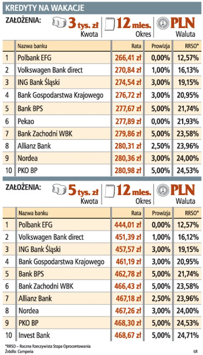 – W tej chwili najtańsze oferty kredytów, którymi można sfinansować wakacyjny wyjazd, są w Polbanku, Volkswagen Banku direct i ING. Są na rynku tańsze oferty, np. Dominet Bank ma kredyt na 8,9 proc., ale to jest propozycja skierowana w praktyce tylko do nielicznych klientów, którzy spełnią wiele dodatkowych wymagań – mówi Karol Wilczko.
