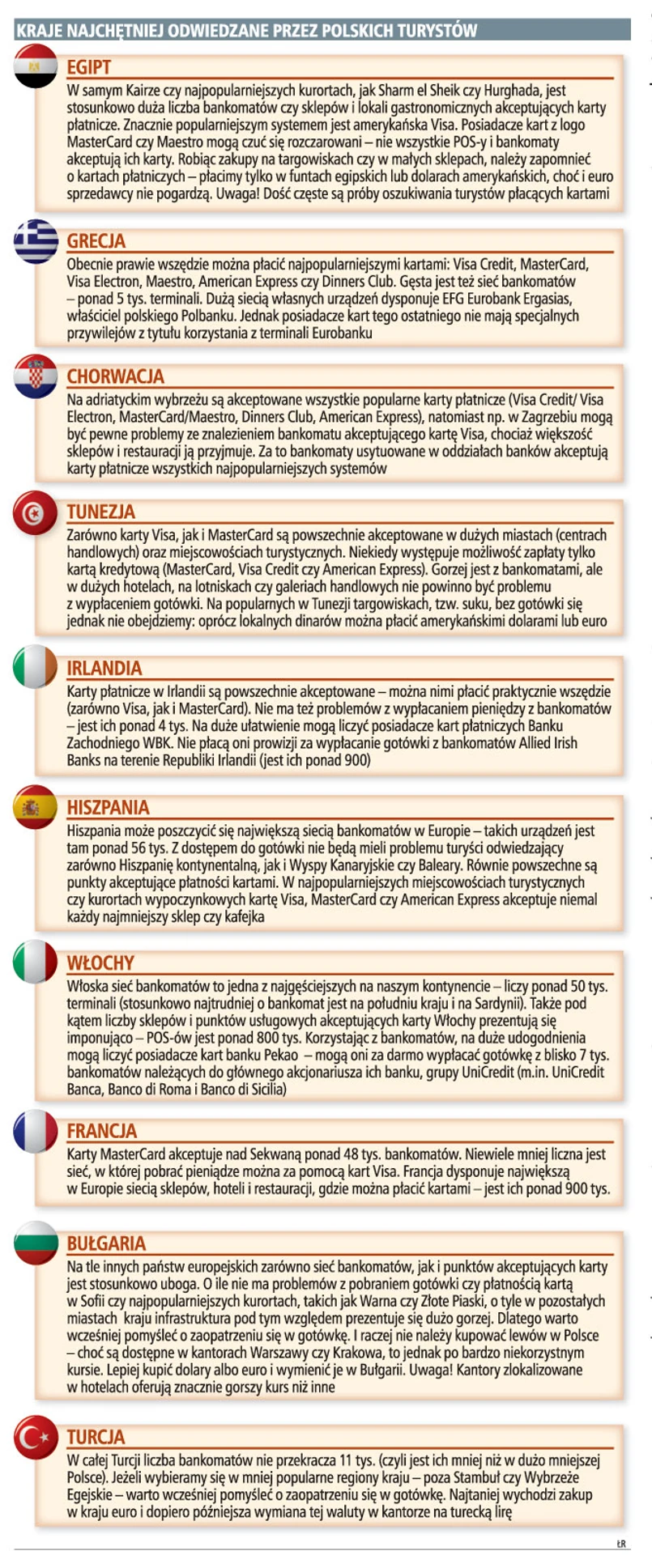 Karty są najpewniejszym środkiem dostępu do naszych pieniędzy w podróży. Warto też pamiętać, że w przypadku utraty karty odpowiedzialność posiadacza karty za wszystkie transakcje dokonane nią przez osoby nieuprawnione jest ograniczona do kwoty równowartości 150 euro. Natomiast po zgłoszeniu bankowi zastrzeżenia karty odpowiedzialność klienta zostaje wyłączona całkowicie.