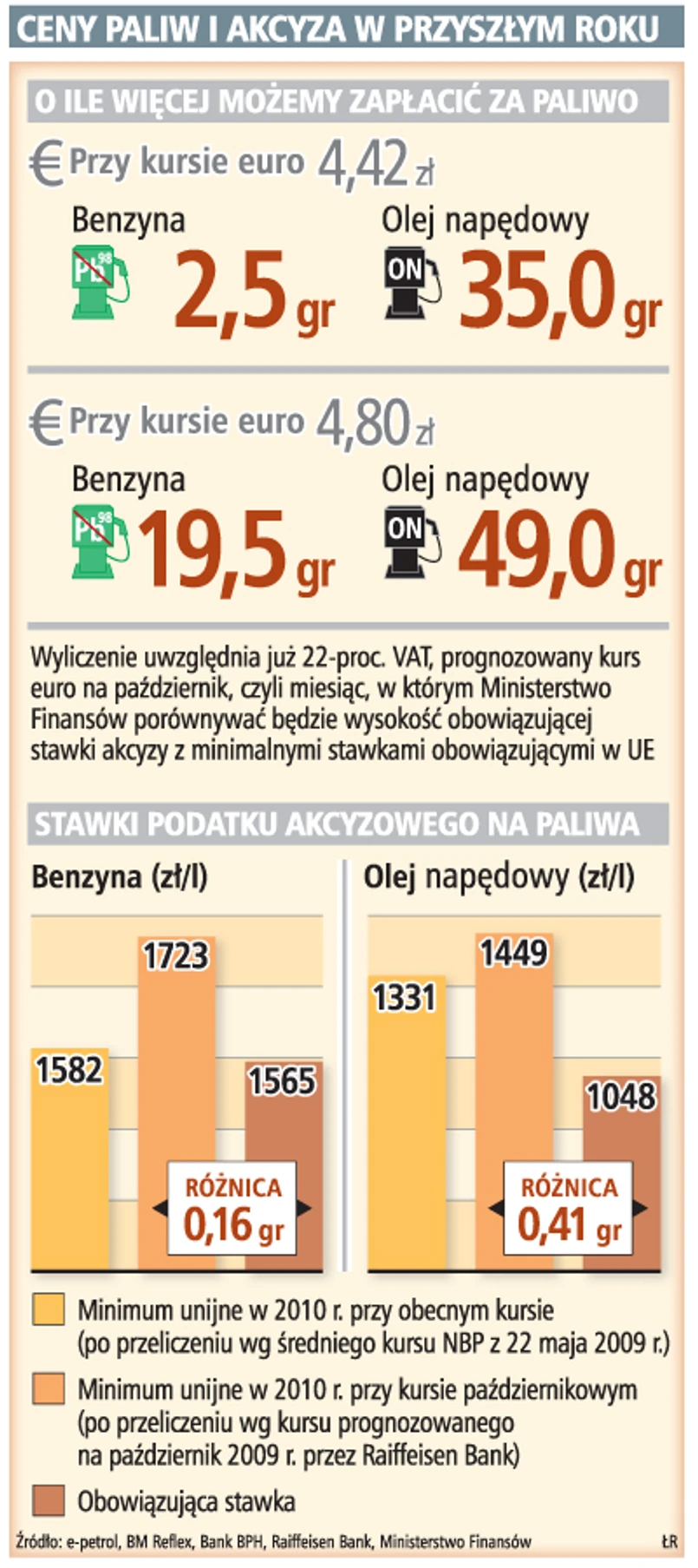 Jeśli jesienią kurs euro nie spadnie o ok. 1 zł, od 2010 roku wzrośnie akcyza na olej napędowy. Co roku rząd musi dostosować wysokość akcyzy w Polsce do minimalnych stawek UE. Diesel na stacjach może zdrożeć o 35–50 gr/l, benzyna – od blisko 3 do 20 gr/l.