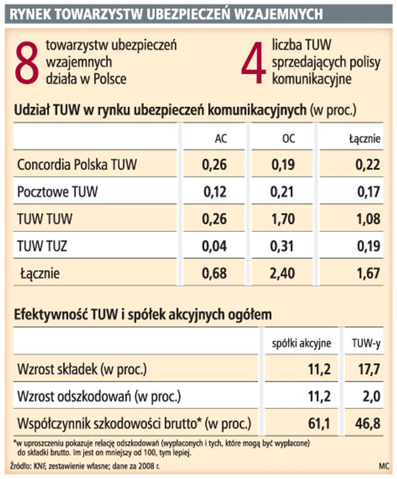 – Nie wiem, czy klienci kupujący polisy w TUW mają świadomość, że w przypadku dużej liczby szkód mogą spotkać się z wezwaniem do dopłaty składki – twierdzi jeden z menedżerów towarzystwa działającego w formie spółki akcyjnej.