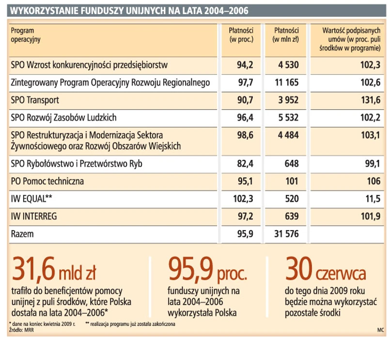 Polska wykorzystała już 96 proc. unijnych pieniędzy, które dostała na lata 2004–2006. Pozostałe unijne dotacje muszą zostać wydane do końca czerwca. W jednym programie – dla sektora rybnego – należy oczekiwać utraty środków.