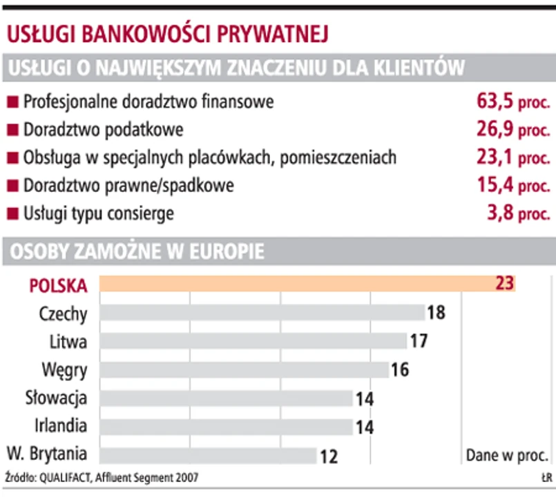 Progi wejścia do elitarnego grona zamożnych Polaków są niższe niż w dojrzałych gospodarkach zachodnich. Aby zostać klientem wealth management, wystarczy 1 mln zł płynnych aktywów. Niektóre banki (np. BRE czy BZ WBK) podnoszą ten próg do 2 mln zł. Ale żeby być superbogatym klientem (UHNWI - Ultra High Net Worth Individuals), należy dysponować majątkiem rzędu 15-20 mln zł. Europejskie standardy wytyczają próg dla HNWI (High Net Worth Individuals) na 1 mln dol., zarządzanie majątkiem zaczyna się od 5 mln dol., a superbogactwo (UHNWI) oznacza majątek rzędu 25-30 mln dol. Banki wiedzą jednak, że pomimo niższego poziomu zamożności polskich bogaczy, pomnażają oni majątek w szybszym tempie niż w dojrzałych gospodarkach, dlatego traktują Polskę jako perspektywiczny rynek. W Polsce, zgodnie z szacunkami Instytutu Badań nad Gospodarką Rynkową, jest obecnie około 6 tys. Polaków posiadających ponad 1 mln dol. płynnych aktywów. Liczba ta może się zwiększać w tempie o ok. 600 osób rocznie (czyli ok. 11 proc.).