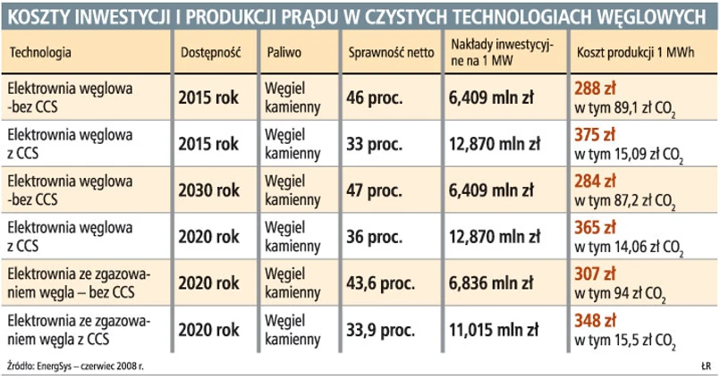 elektrownia węglowa z systemem CCS kosztowałaby aż 4,444 mln euro, co jest porównywalne z kosztami budowy elektrowni atomowej – 4,5 mln euro za 1 MW (ceny bez kosztów kapitałowych). Koszty ochrony środowiska powodują, że elektrownie węglowe mogą być niekonkurencyjne wobec jądrowych czy gazowych, ale do tych drugich ze względu na problemy z zaopatrzeniem w gaz energetyka nie ma przekonania.