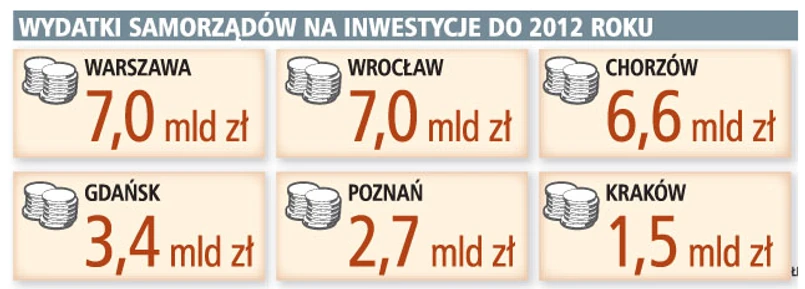 Taki los może spotkać m.in. budowę Trasy Sucharskiego w Gdańsku. Władze miasta szykują się na kłopoty finansowe związane z mniejszymi przychodami do budżetu i poważnie rozpatrują tymczasową rezygnację z inwestycji wartej 600 mln zł. Z kolei Wrocław, którego wskaźnik zadłużenia prawie osiągnął już dopuszczalny limit, czyli poziom 60 proc. rocznych dochodów, tnie inwestycje komunikacyjne, próbując zatrzymać w budżecie kilkaset milionów. Pod znakiem zapytania stoi terminowa rozbudowa lotnisk w podkrakowskich Balicach i Pyrzowicach koło Katowic.
