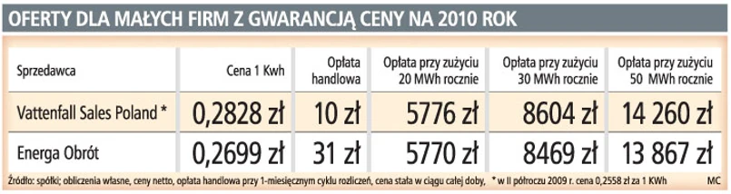 Małe firmy mogą teraz kupić prąd na 2010 rok taniej, niż zapowiada to Vattenfall, acz z wyższą opłatą stałą. Różnice między opłatami są tak duże, że porównać oferty można tylko przez kalkulacje dla konkretnego zużycia.