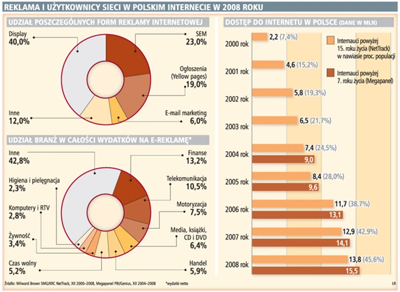 Nigdy nie było tak świetnie. W ubiegłym roku reklamodawcy zwiększyli wydatki na reklamę w internecie aż o 57 proc. i to mimo pierwszych oznak spowolnienia rynku. Dzięki temu nakłady na e-reklamę przekroczyły 1,17 mld zł, a internet stał się czwartym do wielkości rynkiem reklamowym w Polsce. Do 15,5 mln wzrosła liczba osób korzystających z sieci, a dostęp do szerokopasmowego internetu wzrósł do 48 proc. Handel internetowy – zarówno za pośrednictwem aukcji, jak i e-sklepów – zwiększył obroty o 36,4 proc. (do 11,01 mld zł). Taki – według opublikowanego właśnie raportu internet 2008, przygotowanego przez zrzeszającą branżę internetową firmę IAB Polska – był w skrócie rok 2008. Można określić go jako najlepszy w historii. Wszystko wskazuje jednak na to, że na kolejny tak świetny rok branża będzie musiała długo poczekać.