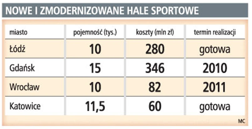 Problem w tym, że w Polsce jest tylko jedna hala widowiskowo-sportowa z prawdziwego zdarzenia. W połowie maja w Łodzi kosztem 280 mln zł został oddany do użytku obiekt na 10 tys. widzów. We wrześniu rozegrane zostaną tu mecze mistrzostw Europy w siatkówce kobiet i koszykówce mężczyzn. Jeśli obiekt na czas uzyska pozwolenie na użytkowanie, to jako pierwsi z hali skorzystają siatkarze podczas meczów Ligi Światowej.