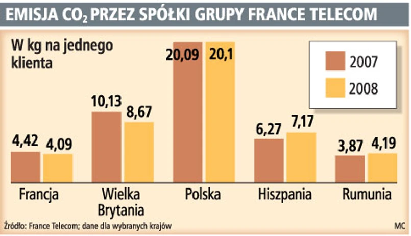 TP bije na głowę inne spółki z grupy FT pod względem emisji CO2 na jednego klienta. W 2008 roku wynosiła ona 20,1 kg i była niemal na tym samym poziomie co rok wcześniej. We Francji w ubiegłym roku emisja CO2 na jednego klienta FT spadła o 7,5 proc. do 4,09 kg.