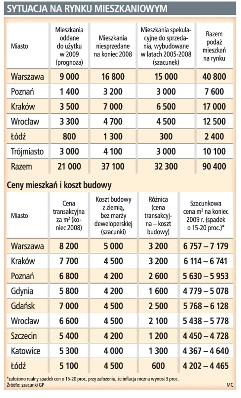 Szacuje się, że na koniec ubiegłego roku tylko na rynku warszawskim, który jest największy w kraju, niesprzedanych było prawie 17 tys. gotowych mieszkań. W innych dużych miastach takich lokali czekających na nabywców było co najmniej drugie tyle. Do tego trzeba jeszcze dodać mieszkania, których budowy są bardzo zaawansowane i które na pewno zostaną w tym roku oddane do użytku. To kolejne 21 tys. mieszkań. Są też lokale, które rok temu kupiono z myślą o ich odsprzedaży po wyższych cenach. Dzisiaj ich właściciele mają często problemy finansowe, bo muszą spłacać kredyty. Nierzadko sprzedaż takich mieszkań staje się dla nich jedynym wyjściem z sytuacji. Szacuje się, że w tym roku takich mieszkań na rynku pojawi się 33 tys. Dla deweloperów to dzisiaj największa konkurencja, bo często te mieszkania są sprzedawane poniżej ceny zakupu. W sumie liczba nowych mieszkań w dużych miastach, które są na rynku lub w tym roku na niego trafią, przekracza 90 tys. sztuk. Przy mniejszym zainteresowaniu rzeczywiście mogą te lokale zaspokoić popyt przez najbliższe lata. Niektórzy eksperci sytuację oceniają inaczej.
