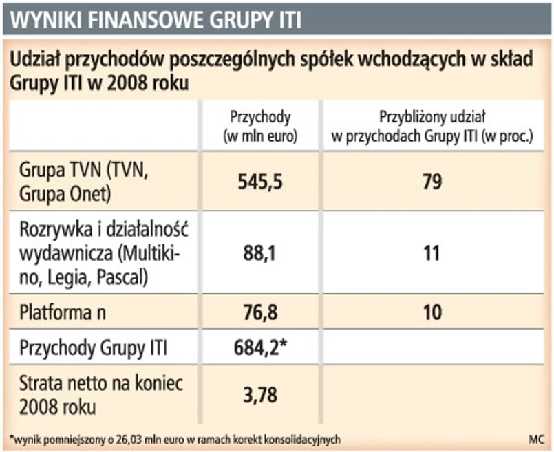 Grupa ITI zadłużyła się na 320 mln euro w 2007 roku w konsorcjum kilku banków (m.in. w Pekao, Calyon, Rabobank). Holding ma jeszcze dwie pożyczki krótkoterminowe na łączną kwotę 40 mln euro, ale nie korzysta z nich w całości. Pieniądze potrzebne były na inwestycje, m.in. na finansowanie rozwoju platformy satelitarnej n, a jako zabezpieczenie kredytu właściciele Grupy ITI zastawili swoje akcje imienne Grupy TVN. Problem pojawił się, gdy wybuchł kryzys i banki same zaczęły mieć problem z pieniędzmi. Gdy Grupa TVN przejęła od ITI 51 proc. udziałów w platformie n, a rynek przyjął tę informację negatywnie i kurs TVN zanurkował, banki – wykorzystując sytuację – zażądały korekty umowy.