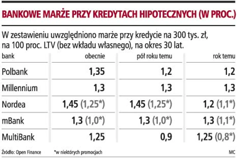 Z zestawienia przygotowanego przez Open Finance dla kilku banków wynika, że średnie marże są w miarę stabilne, choć w przypadku np. Polanku koszt wzrósł, choć dotyczy to kredytów na 100 proc. wartości nieruchomości.