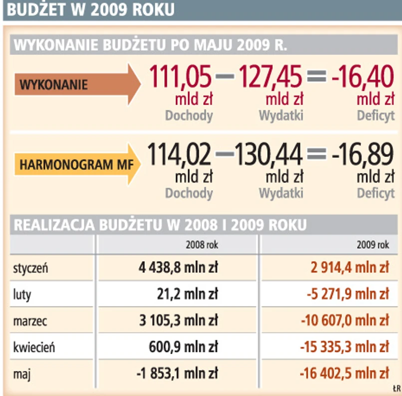 Z danych MF wynika, że deficyt budżetu po pięciu miesiącach wyniósł ponad 16,4 mld zł. To już 90 proc. planu na cały rok. To zgodne z tym, co Ministerstwo Finansów zapisało w tzw. harmonogramie wykonania budżetu w tym roku. Resort założył w nim, że deficyt wyniesie prawie 16,9 mld zł. Ale zakładał także dochody w wysokości 114 mld zł. Tymczasem do państwowej kasy po pięciu miesiącach wpłynęło niewiele ponad 111 mld zł.